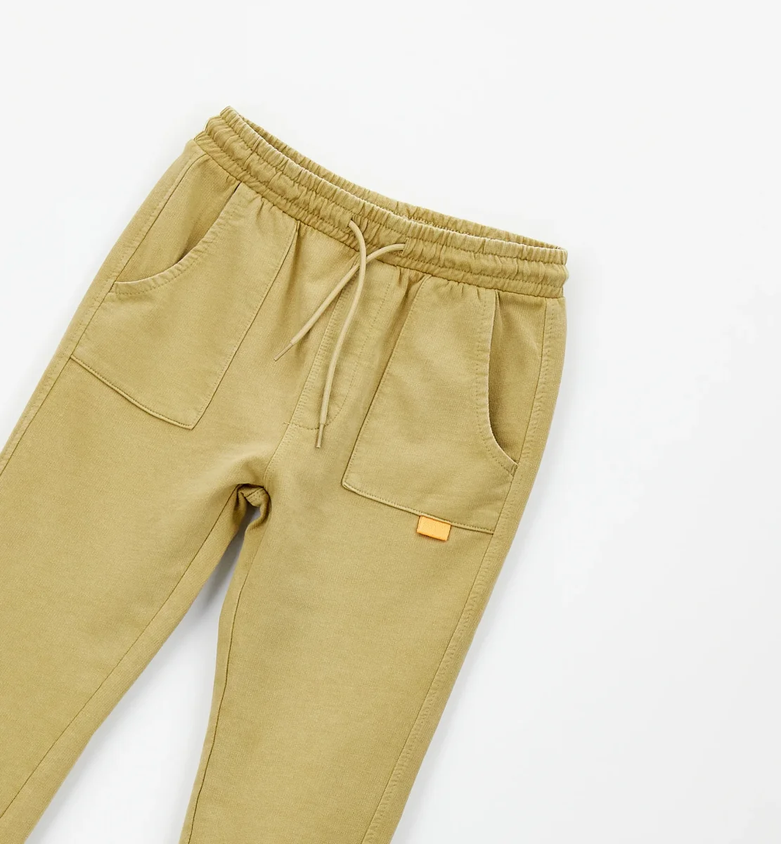 pantalone jogger bambino senape con tasche applicate โ pantalone lungo in morbido cotone felpato color senape con tasche frontali applicate che donano un look casual e contemporaneo. modello con elastico in vita e coulisse regolabile, fondo gamba con polsino elasticizzato per una vestibilitร pratica e confortevole. ideale da abbinare a t-shirt e felpe per outfit sportivi e versatili perfetti per scuola e tempo libero.