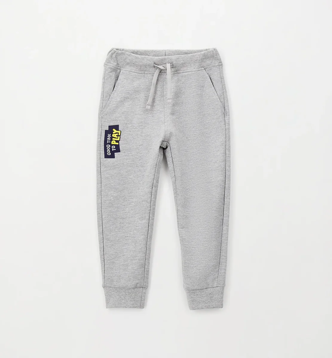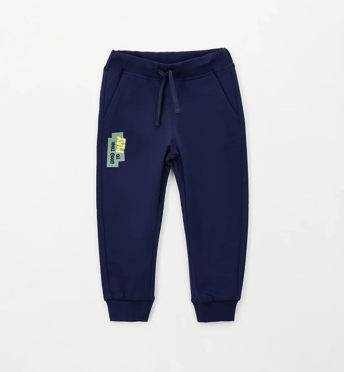 pantalone jogger bambino blu navy e grigio melange con stampa laterale โ pantalone sportivo in morbido cotone felpato dalla vestibilitร comoda, caratterizzato da elastico in vita con coulisse regolabile che assicura comfort e praticitร nei movimenti. modello con tasche laterali e fondo con polsino elasticizzato, impreziosito da stampa gommata laterale โgood time to playโ in contrasto colore che dona un tocco dinamico e moderno. perfetto da abbinare a felpe e t-shirt per outfit casual ideali per la scuola e il tempo libero.