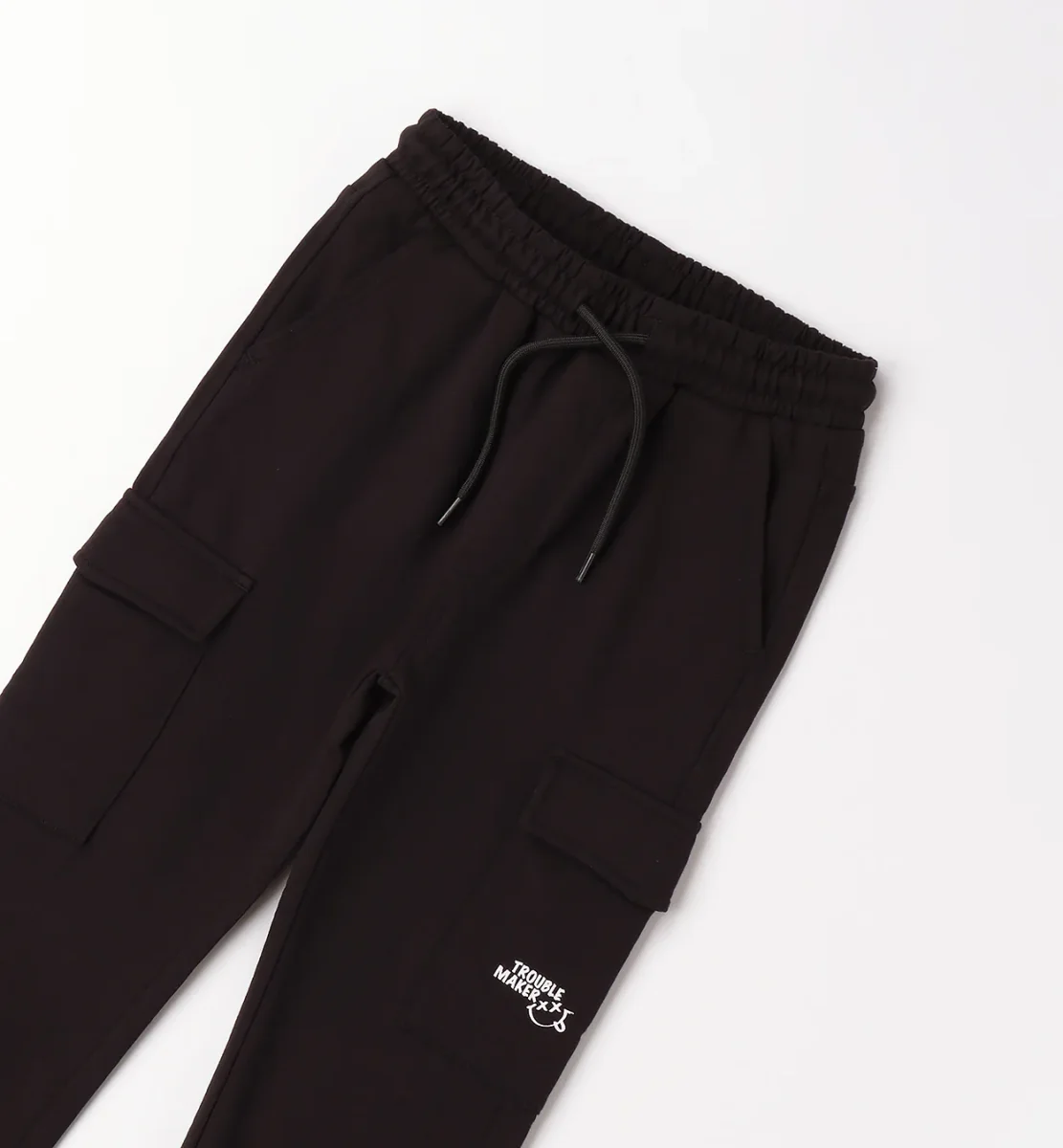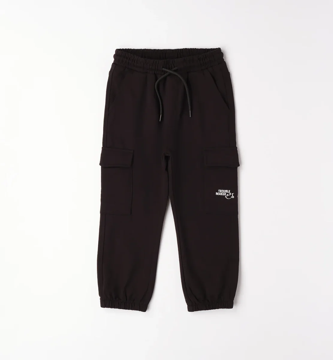 pantalone jogger cargo bambino nero con tasconi laterali e stampa โ pantalone in felpa di cotone dal taglio sportivo e contemporaneo, caratterizzato da pratici tasconi cargo applicati sui lati e stampa lettering โtrouble makerโ con grafica smile sulla gamba. modello con elastico in vita e coulisse regolabile, tasche laterali e fondo con polsino elasticizzato per una vestibilitร comoda e stabile. ideale per look casual e street, perfetto da abbinare a t-shirt, felpe o giubbini per outfit dinamici adatti a scuola e tempo libero.