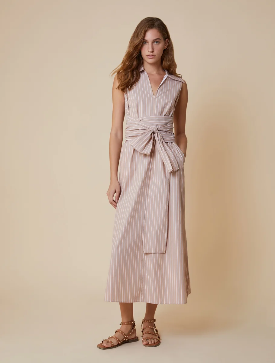 Per uno stile on point anche nei giorni piรน caldi, lโabito in popeline croccante delinea la silhouette con maxi fusciacche.