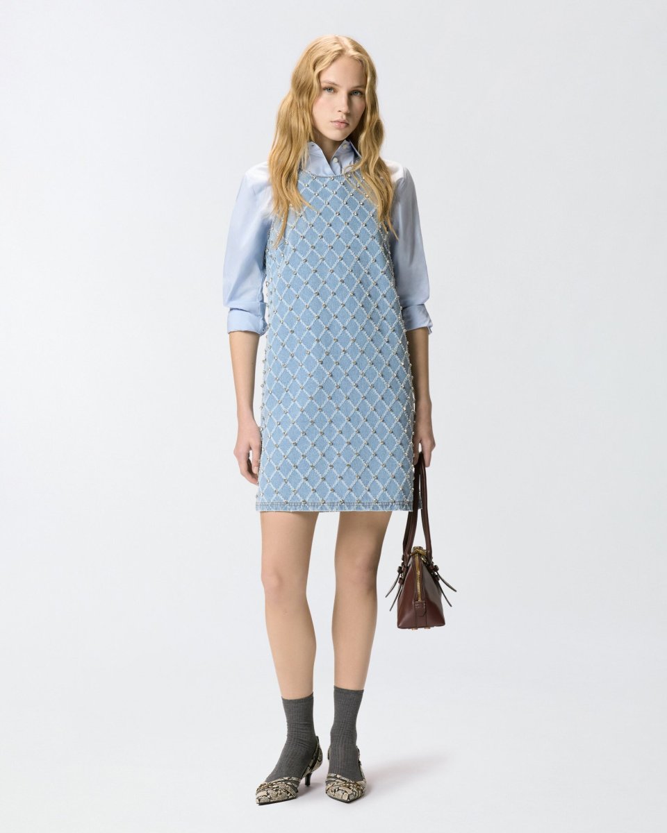 PINKO Abito corto in denim con disegno rombi e strass
