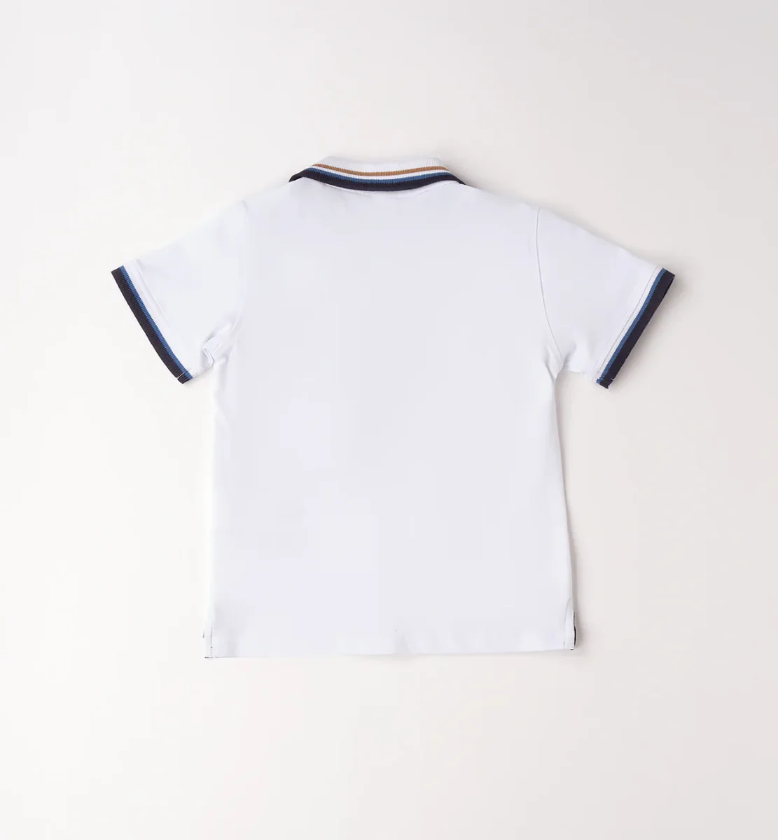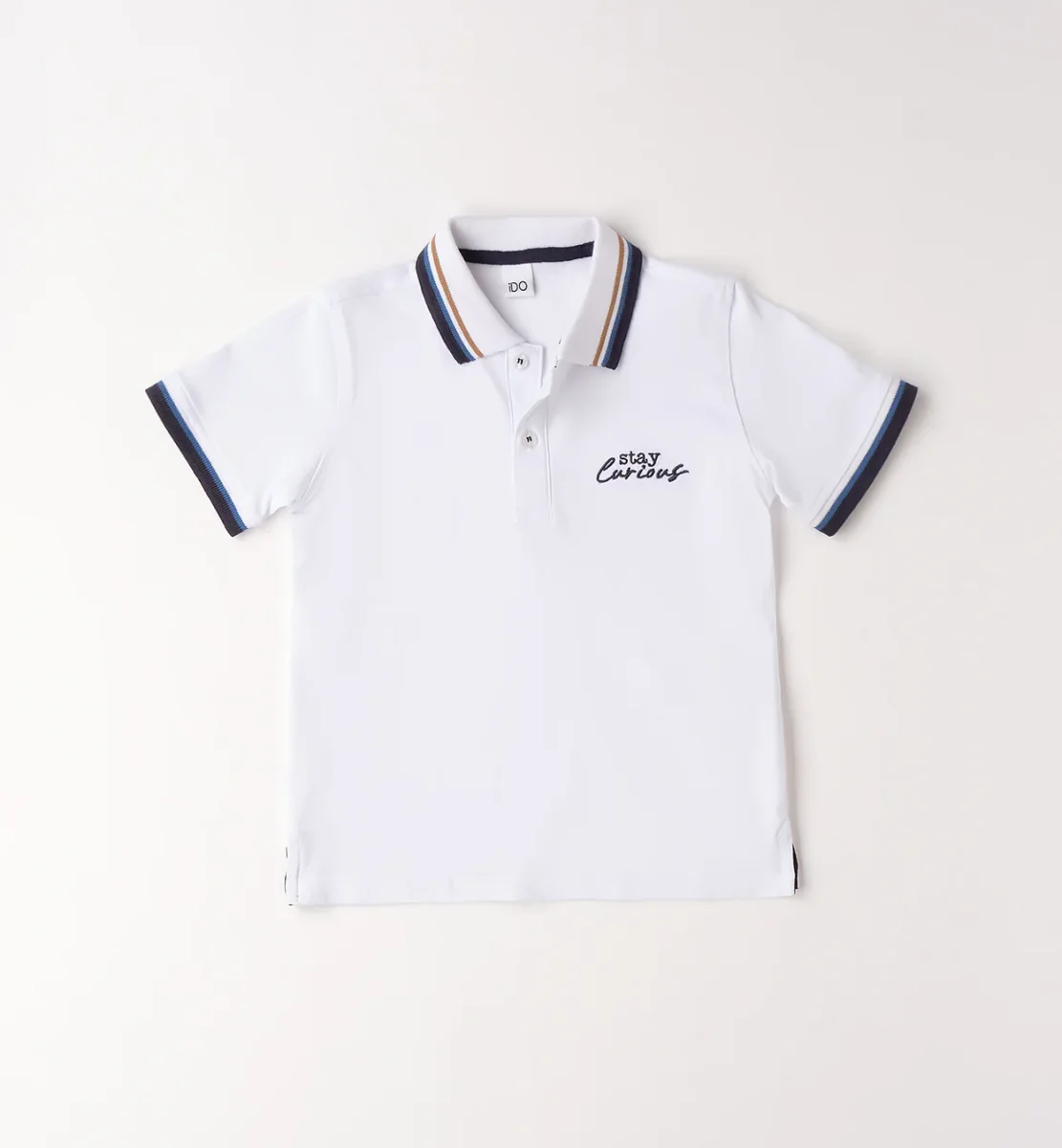 polo bambino bianca con ricamo e profili rigati โ polo a manica corta in cotone piquet dal design pulito e curato, con colletto e bordi manica rifiniti da righe a contrasto blu e beige che donano un tocco sportivo. chiusura frontale con bottoni e ricamo lato cuore โstay curiousโ per uno stile casual ma ricercato. vestibilitร comoda, perfetta da abbinare a jeans, bermuda o pantaloni chino per outfit estivi ordinati e versatili, ideali sia per il tempo libero che per occasioni piรน curate.