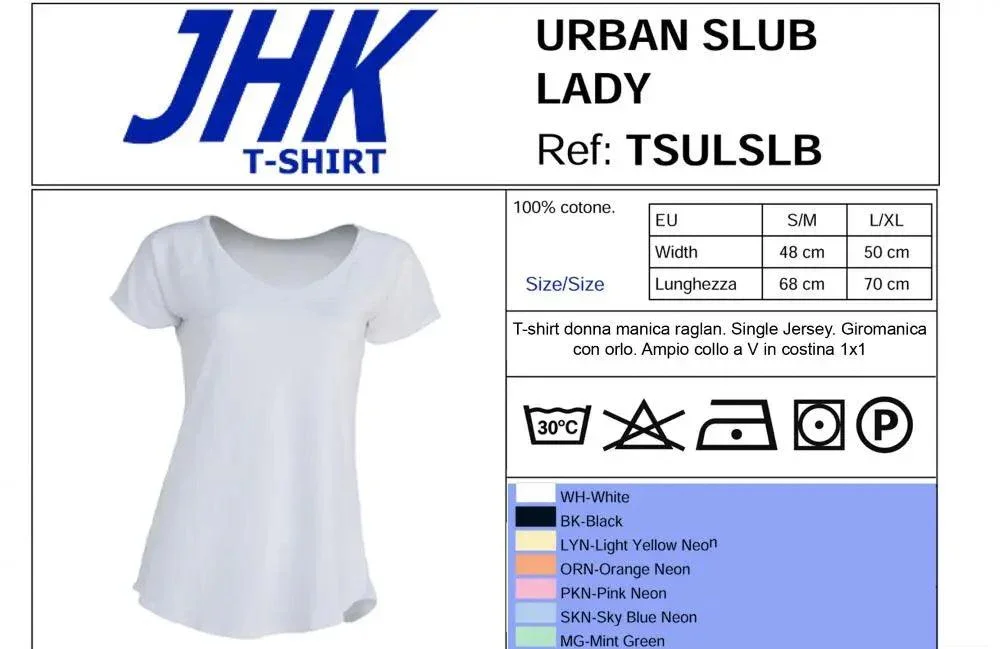 T-shirt URBAN SLUB Lady DETTAGLI TSULSLB-EXP120 g/m2 100% cotone single jerseyampia scollatura a V in costina 1 x 1manica raglan SCHEMA TAGLIE/MISURE IN CMTAGLIE S-M L-XL A (cm) 48 cm 50 cm B (cm) 68 cm 70 cm