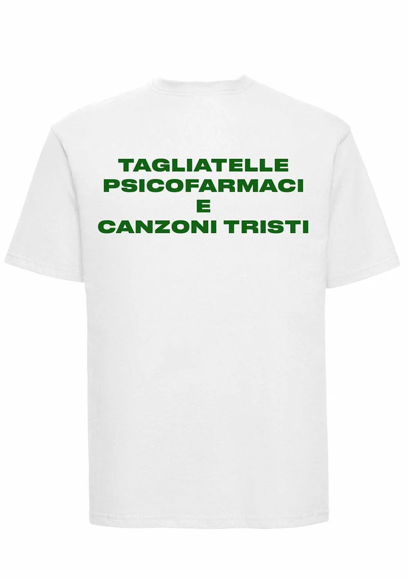 TSHIRT REGULAR FIT โTAGLIATELLE, PSICOFARMACI E CANZONI TRISTIโ COLORE: BIANCO COMPOSIZIONE: 100% COTONE
