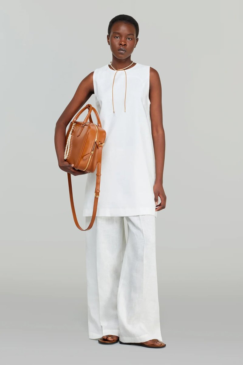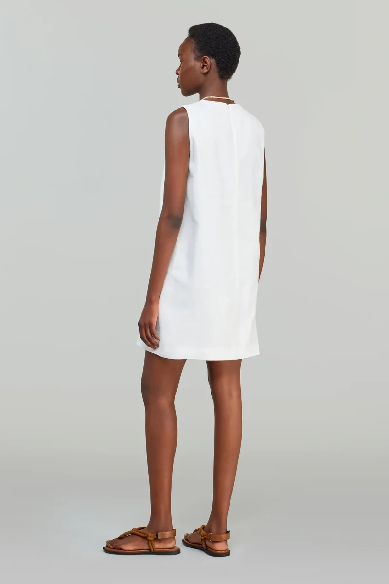 Abito in lino. Modello girocollo, smanicato, lunghezza al ginocchio. Vestibilitรย aderente.