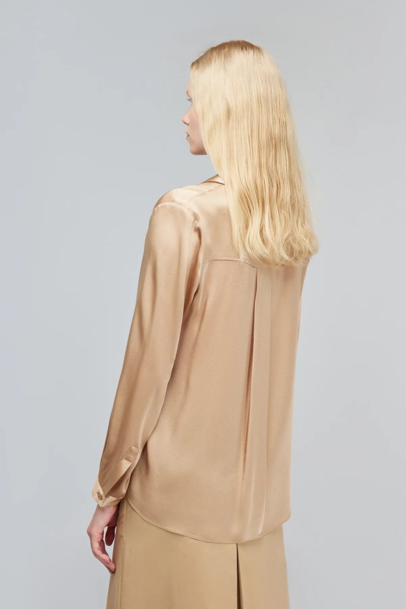 Camicia in rasetto. Manica lunga con polsino. Colletto classico, abbottonatura frontale. Due spacchetti laterali. Lunghezza bacino, vestibilitรย regular.