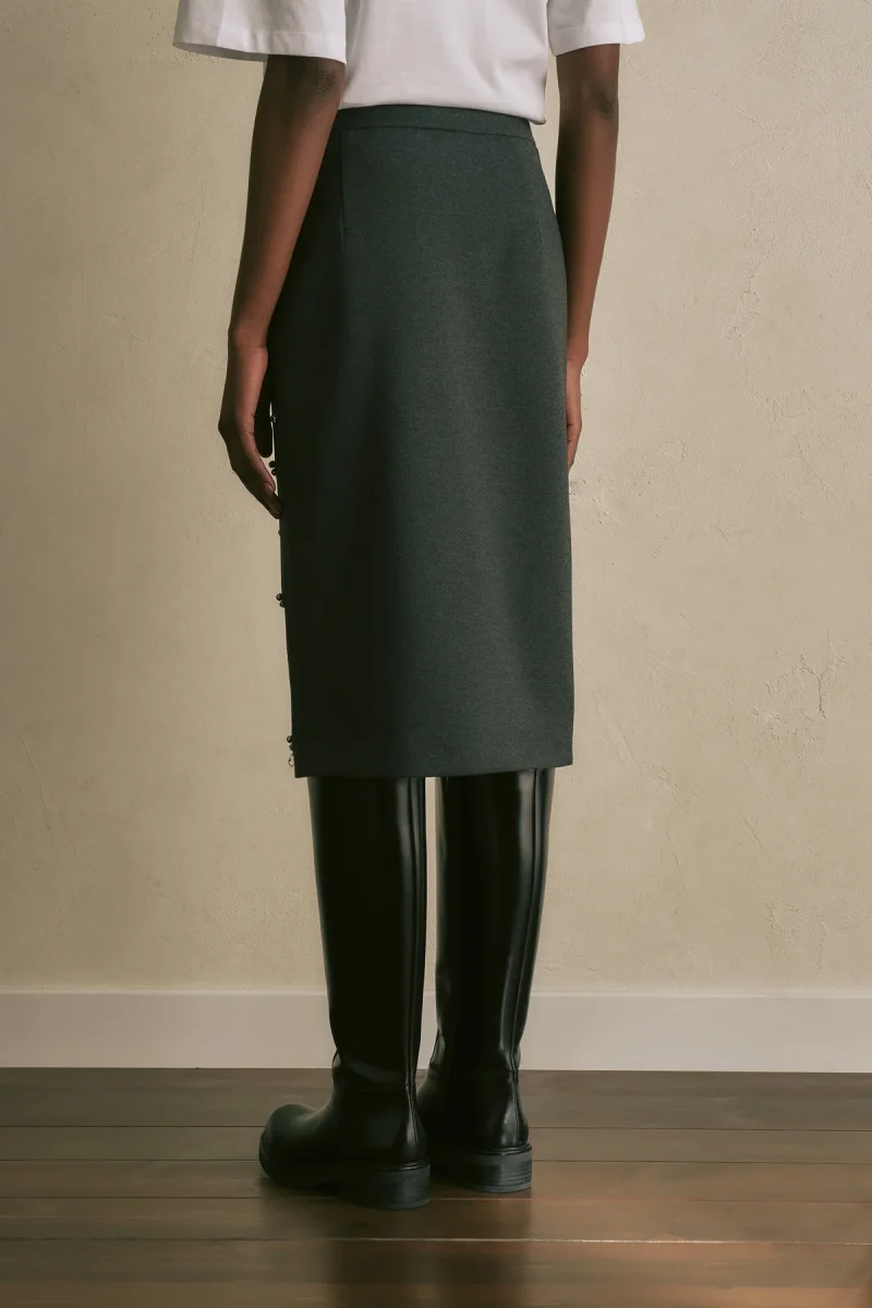 Gonna modello pencil in punto milano. Modello con ricamo all over sul davanti, in strass e pendenti. Vestibilitรƒย ร‚ย  aderente.