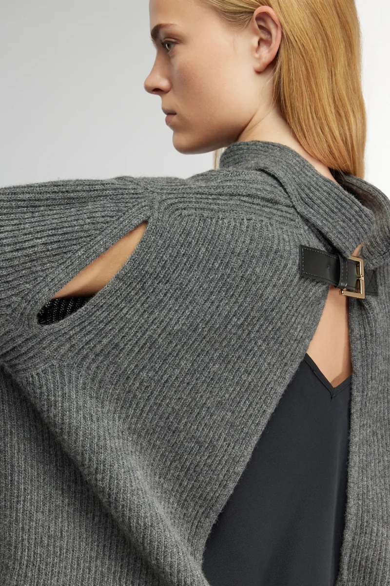 Maglia dolcevita in misto lana. Manica lunga. Apertura sul retro, inserto in crepe de chine e dettaglio fibbie. Vestibilitร regular.
