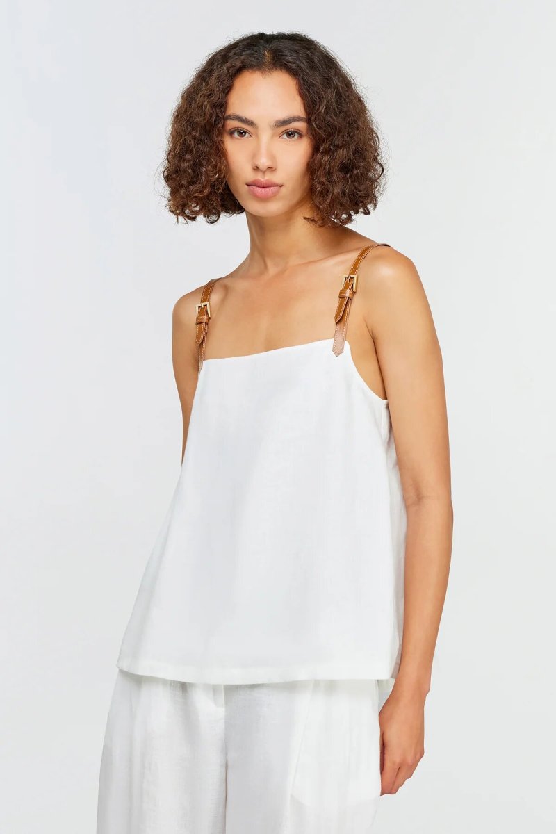 Top in lino. Spalline regolabili in cuoio con fibbia. Pieghe sul retro. Vestibilitรย regular, lunghezza bacino.