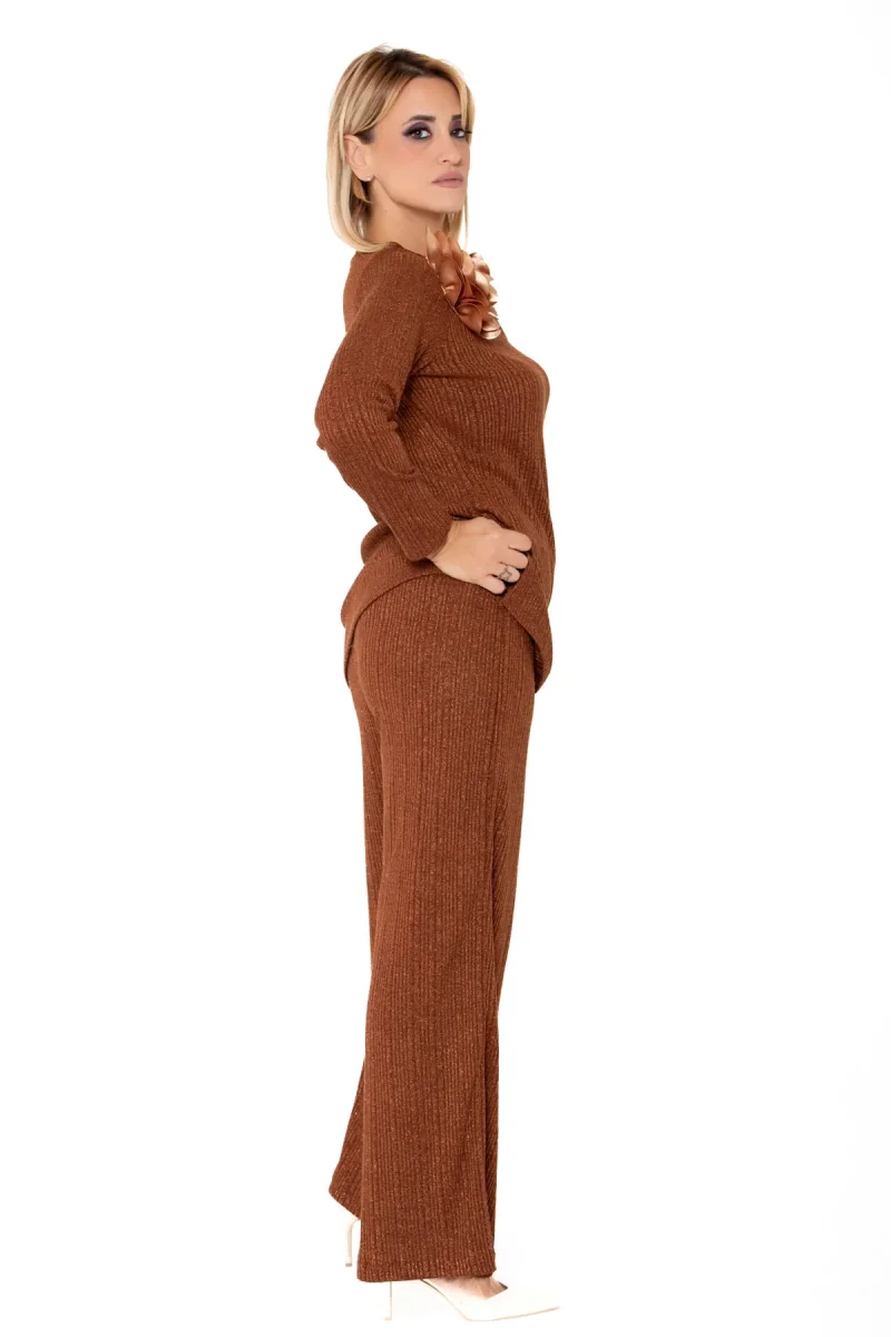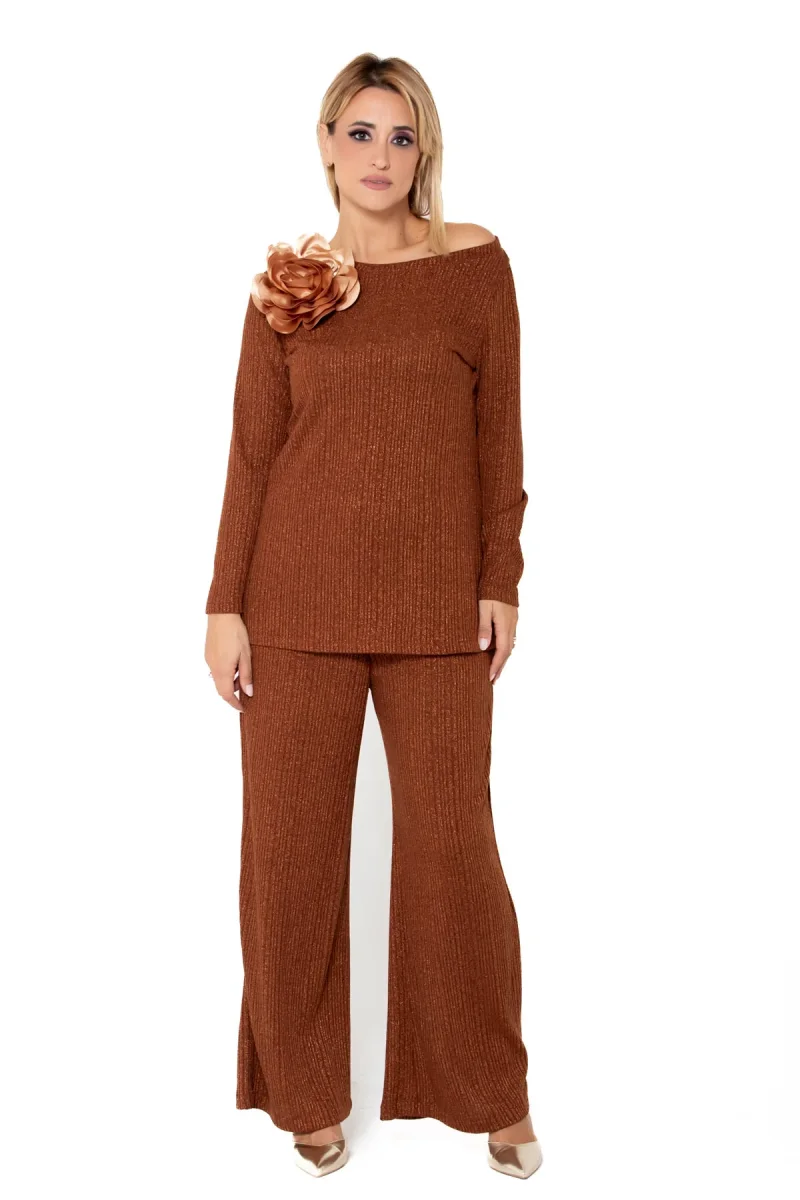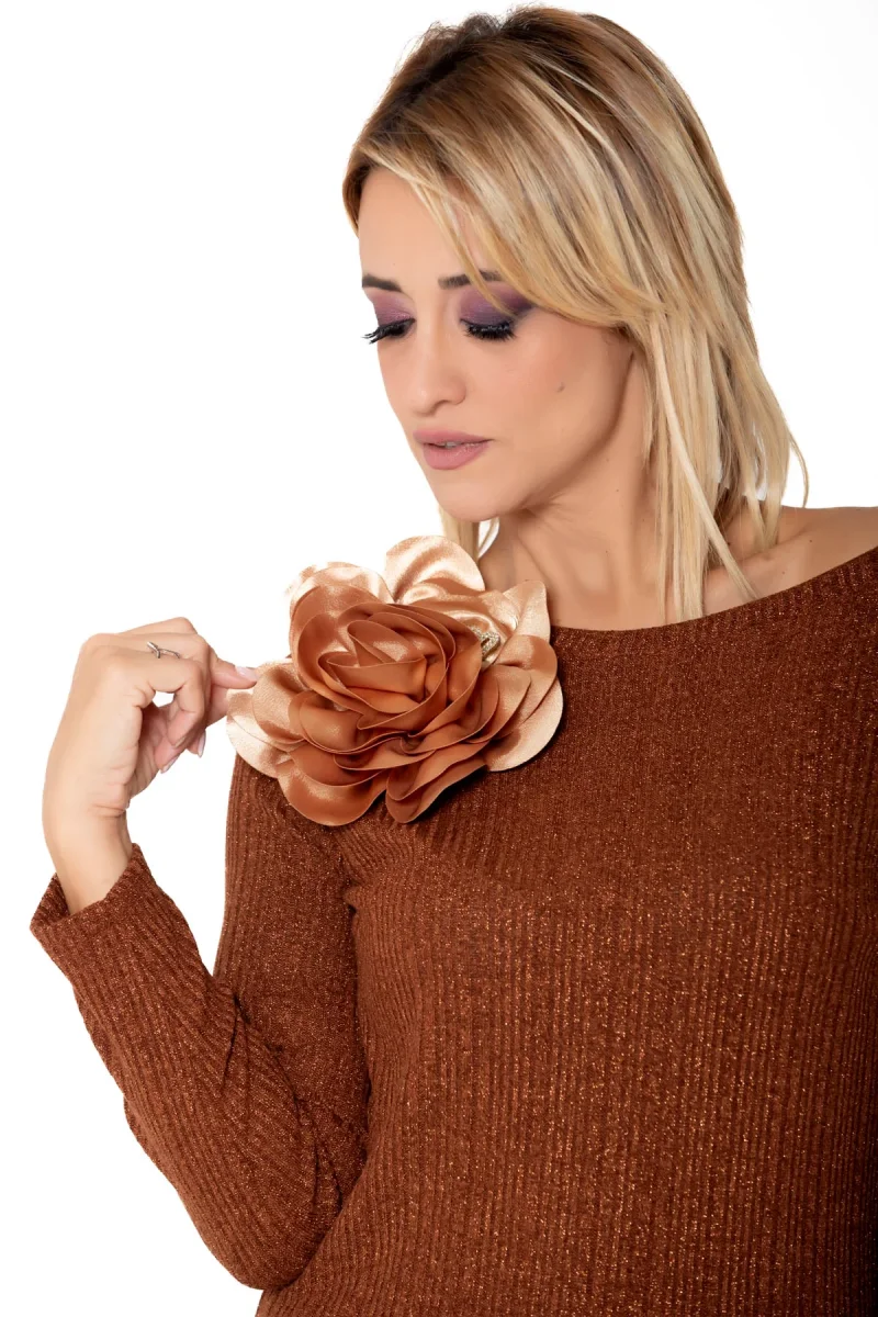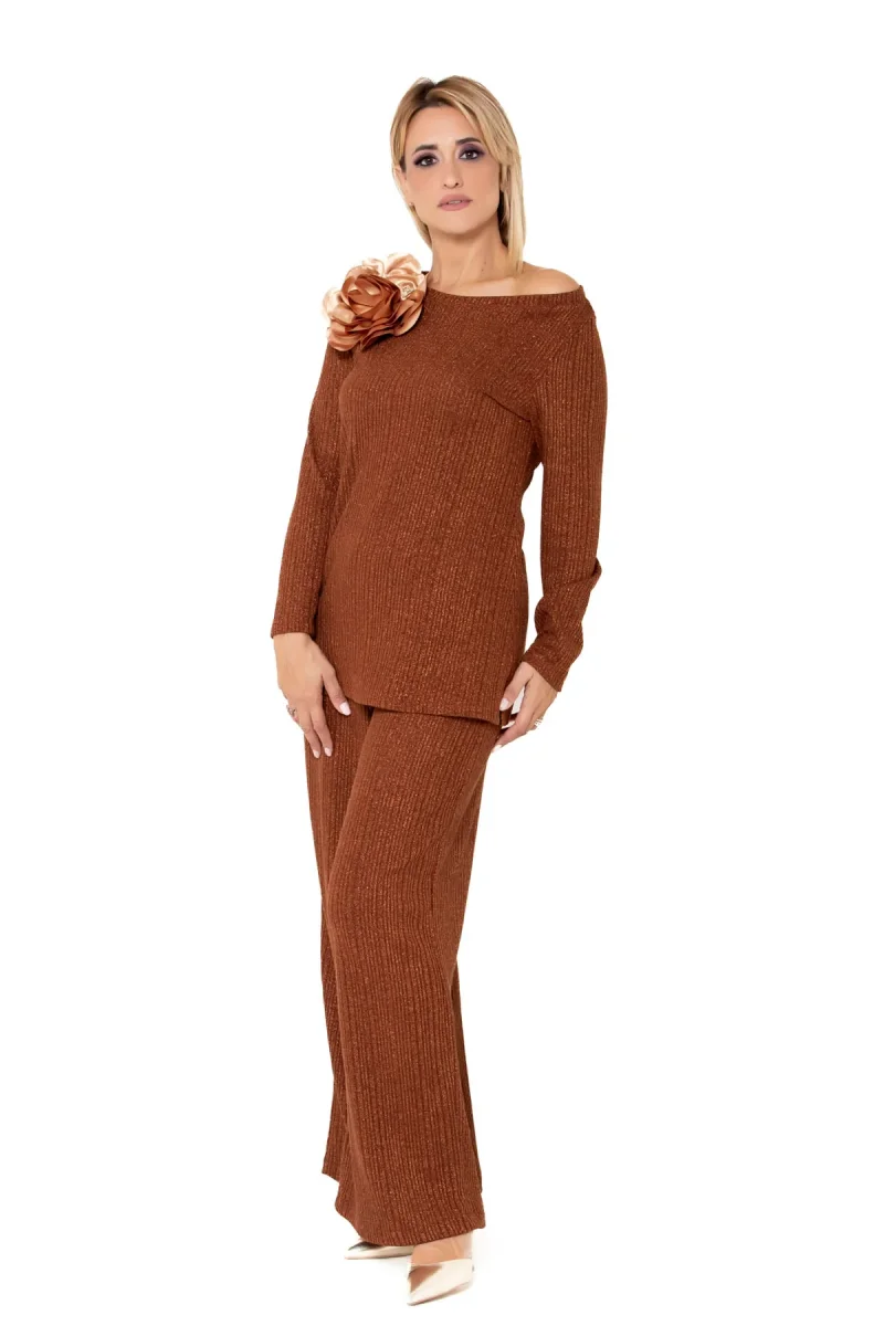 Set in morbida maglia lurex color tabacco con scollo a barca impreziosito da un maxi fiore oro scuro.