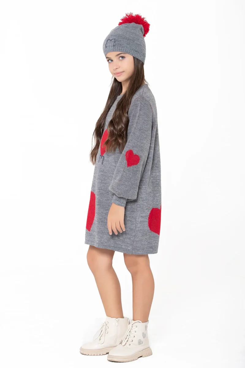 Maxipull in misto lana con cuori asimmetrici rossi a contrasto, spalla scesa e logo grigio glitter. Maniche a sbuffo per unire casual a ricercato.