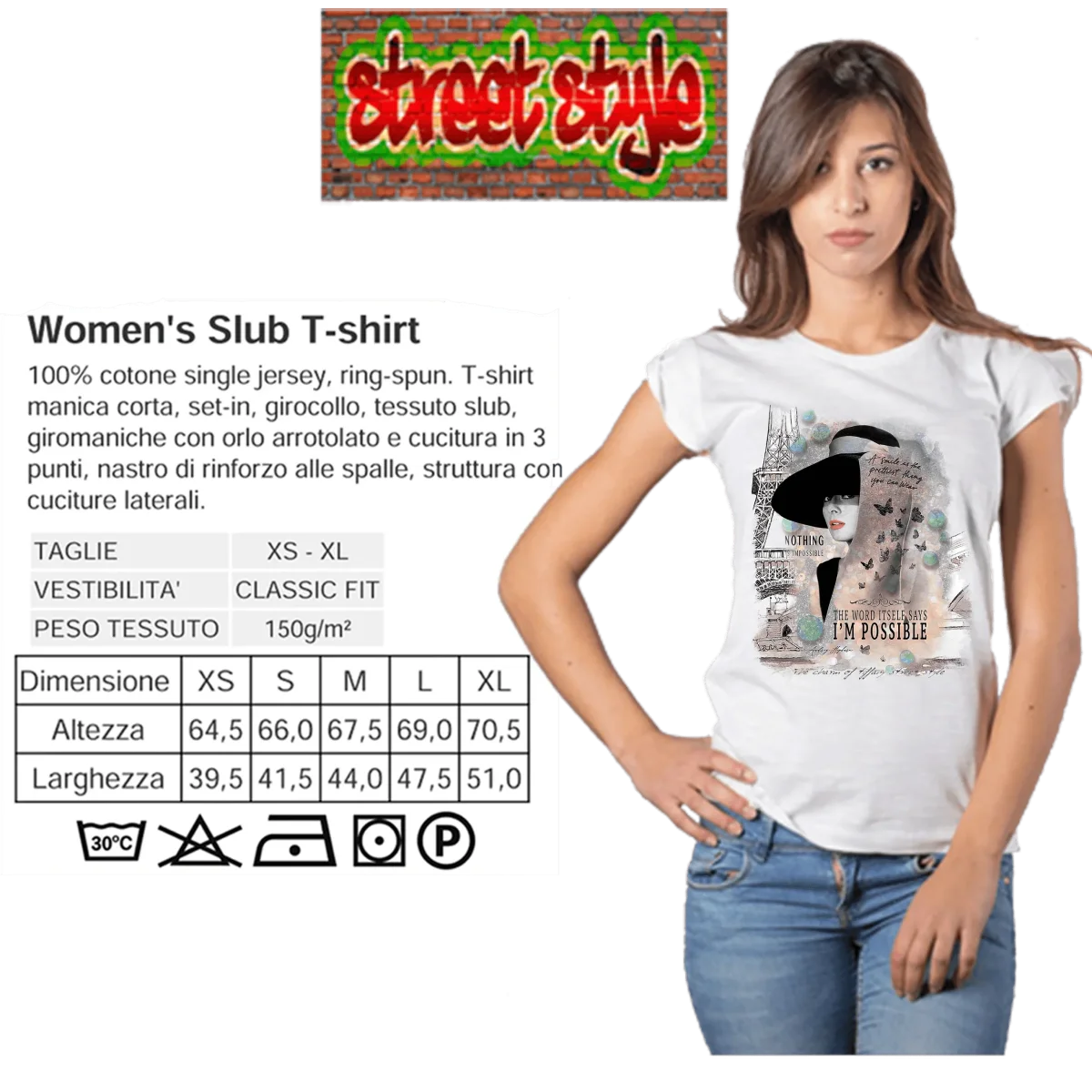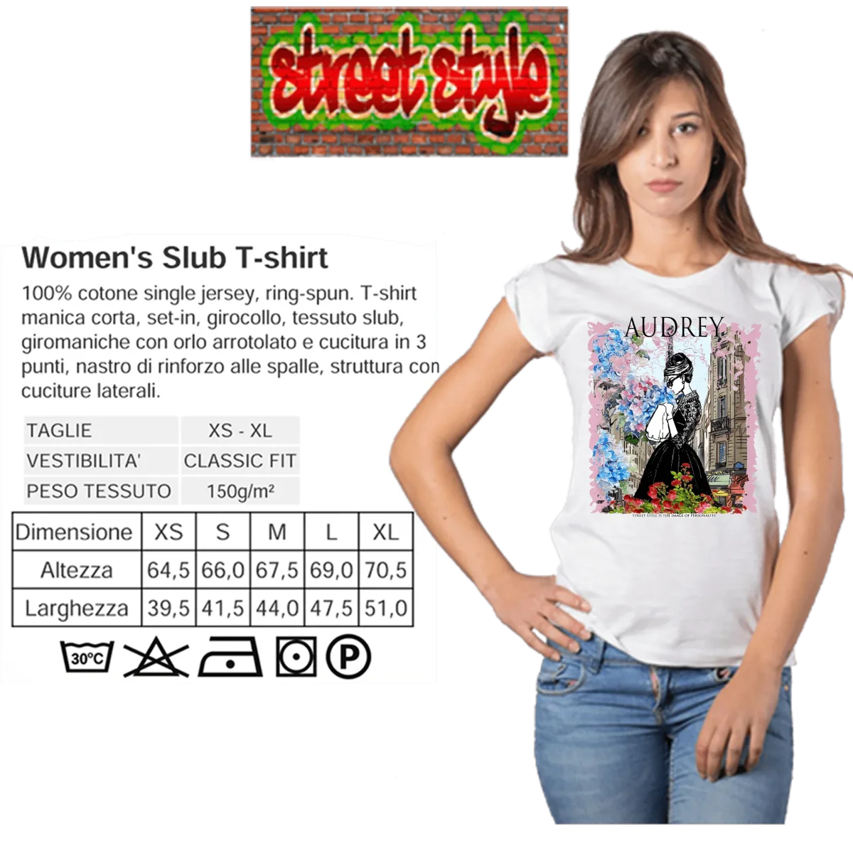 Per chi cerca uno stile urbano e raffinato, questa T-shirt unisce estetica cinematografica e responsabilitร ambientale. Disponibile dalla XS alla XL con guide taglie precise per una scelta sicura. Aggiungi un tocco di fascino senza tempo al tuo outfit: ordina ora la T-shirt Audrey Hepburn donna Slub e fai tua la bellezza sostenibile di STREET STYLE.