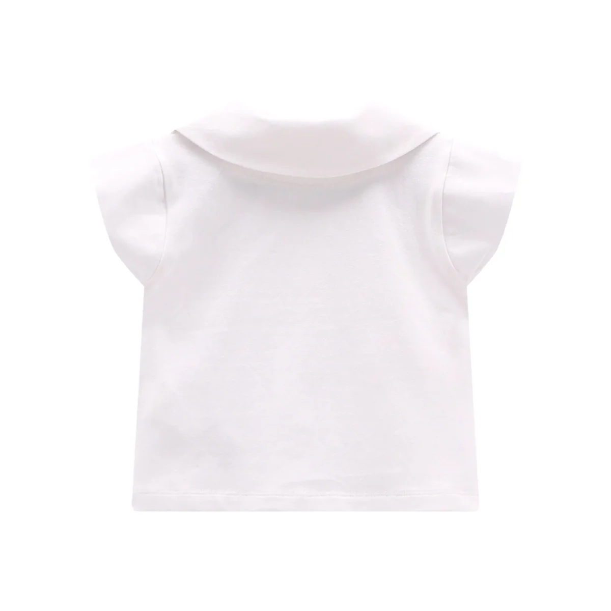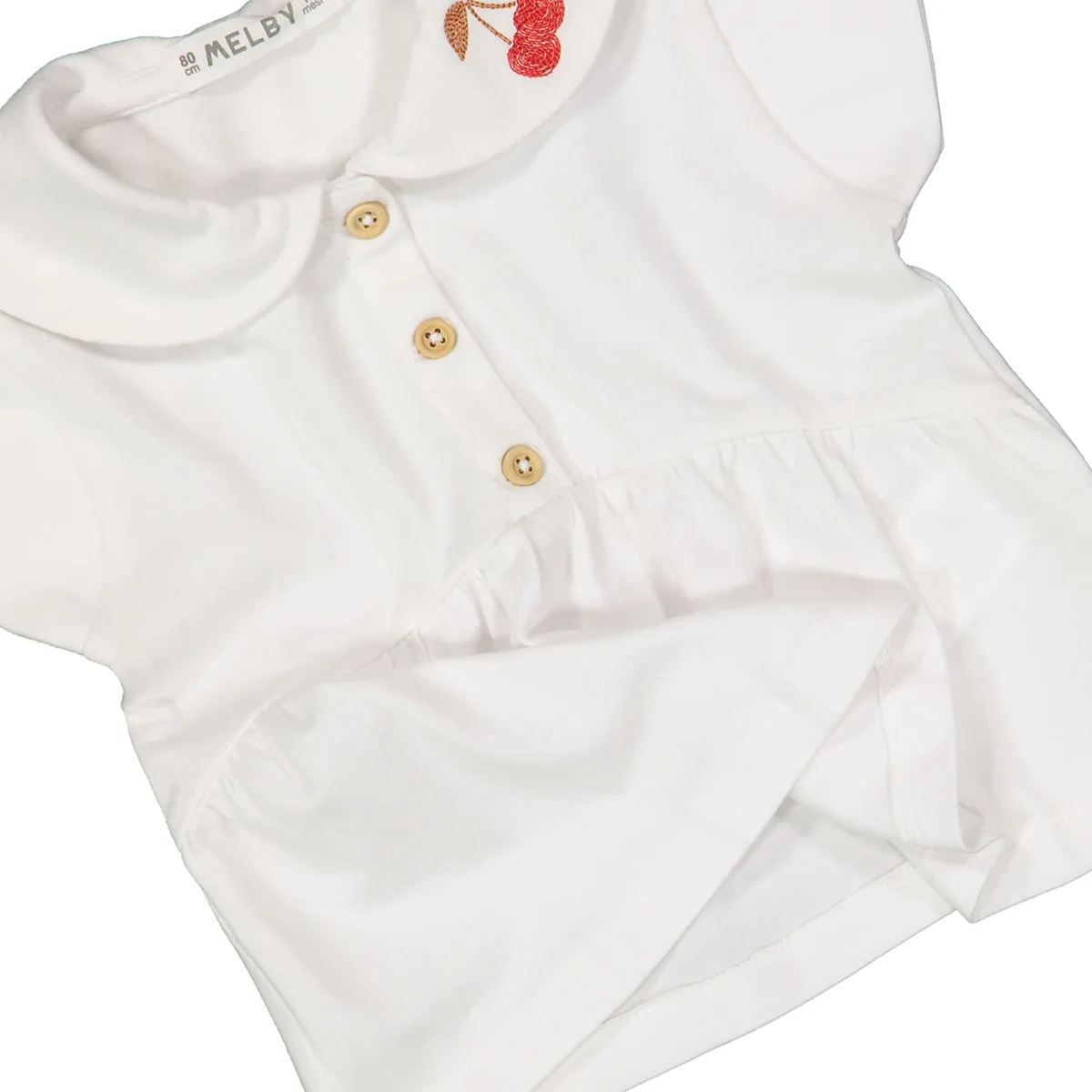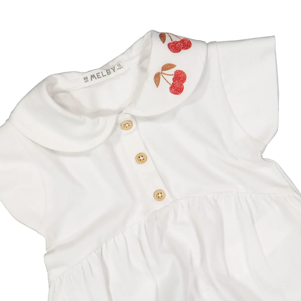 t-shirt bambina bianca con colletto ricamato ciliegie โ€“ t-shirt in morbido cotone dalla linea svasata, impreziosita da colletto tondo con delicato ricamo ciliegie e bottoncini frontali effetto legno. modello con maniche corte a volant e taglio arricciato sotto il petto che dona movimento e vestibilitร  confortevole, perfetta per look estivi freschi e raffinati, ideale da abbinare a shorts, gonne o leggings per outfit dolci e curati.