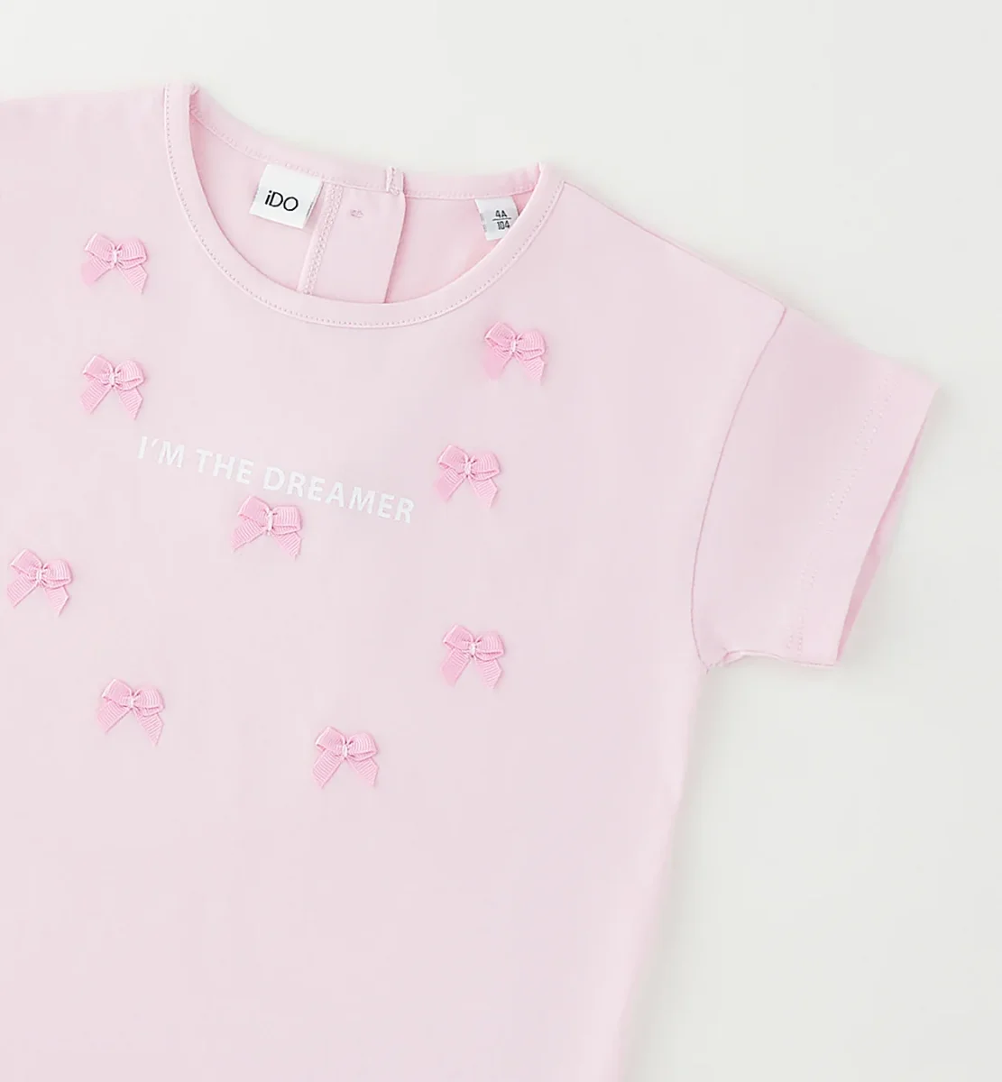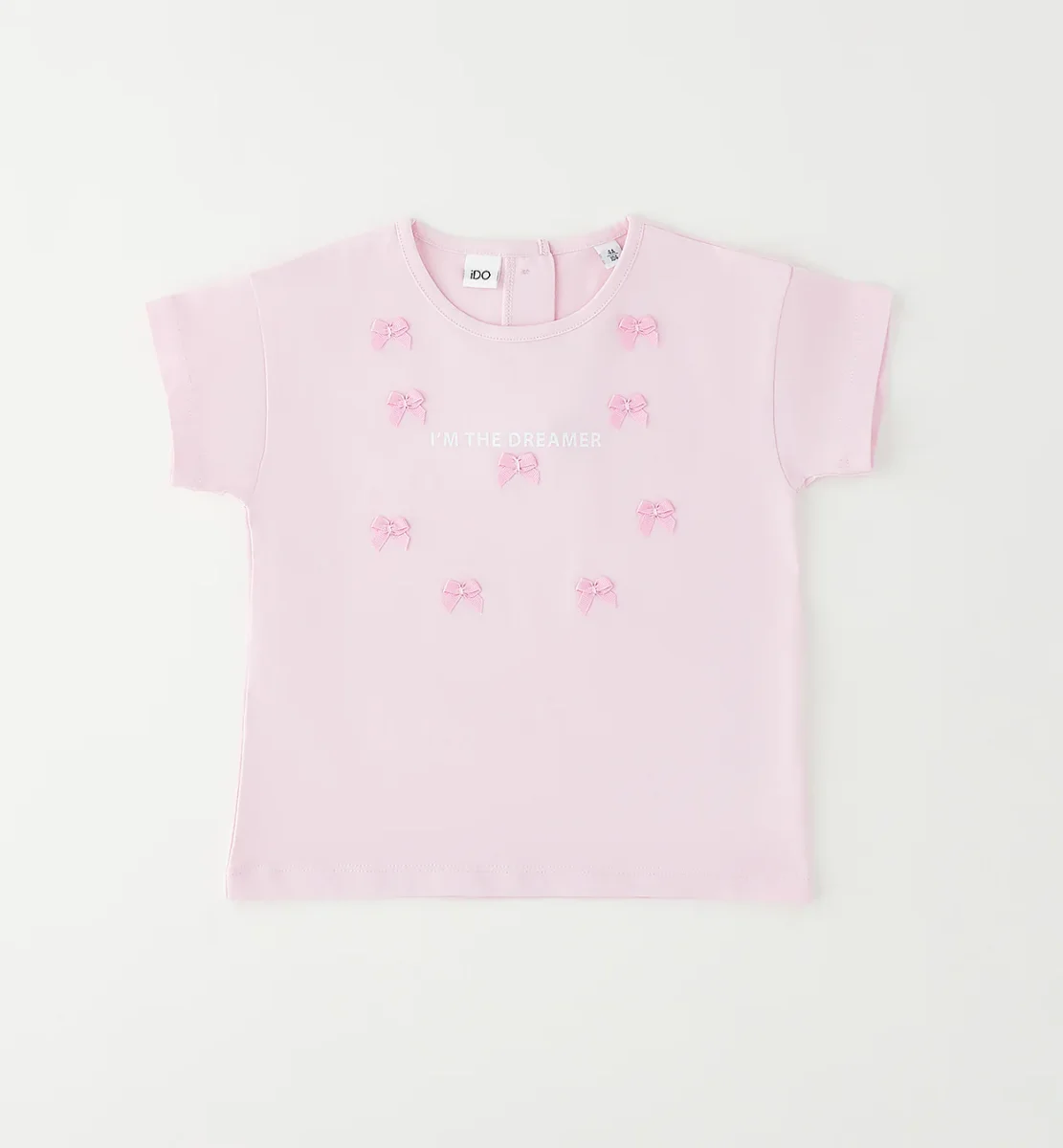 t-shirt bambina rosa con fiocchetti applicati โ maglietta a manica corta in morbido cotone rosa pastello impreziosita da delicati fiocchetti applicati tono su tono sul davanti e scritta centrale โIโM THE DREAMERโ. modello con girocollo classico e pratici bottoncini posteriori per una vestizione facilitata, dalla vestibilitร comoda e femminile. perfetta da abbinare a shorts, leggings o gonne per outfit dolci e curati ideali per il tempo libero.