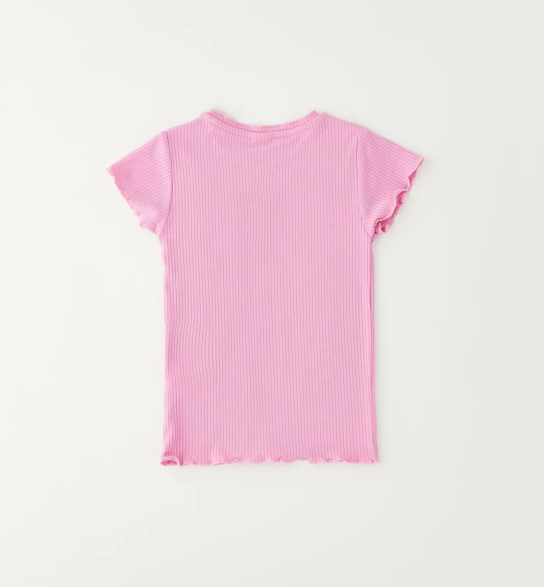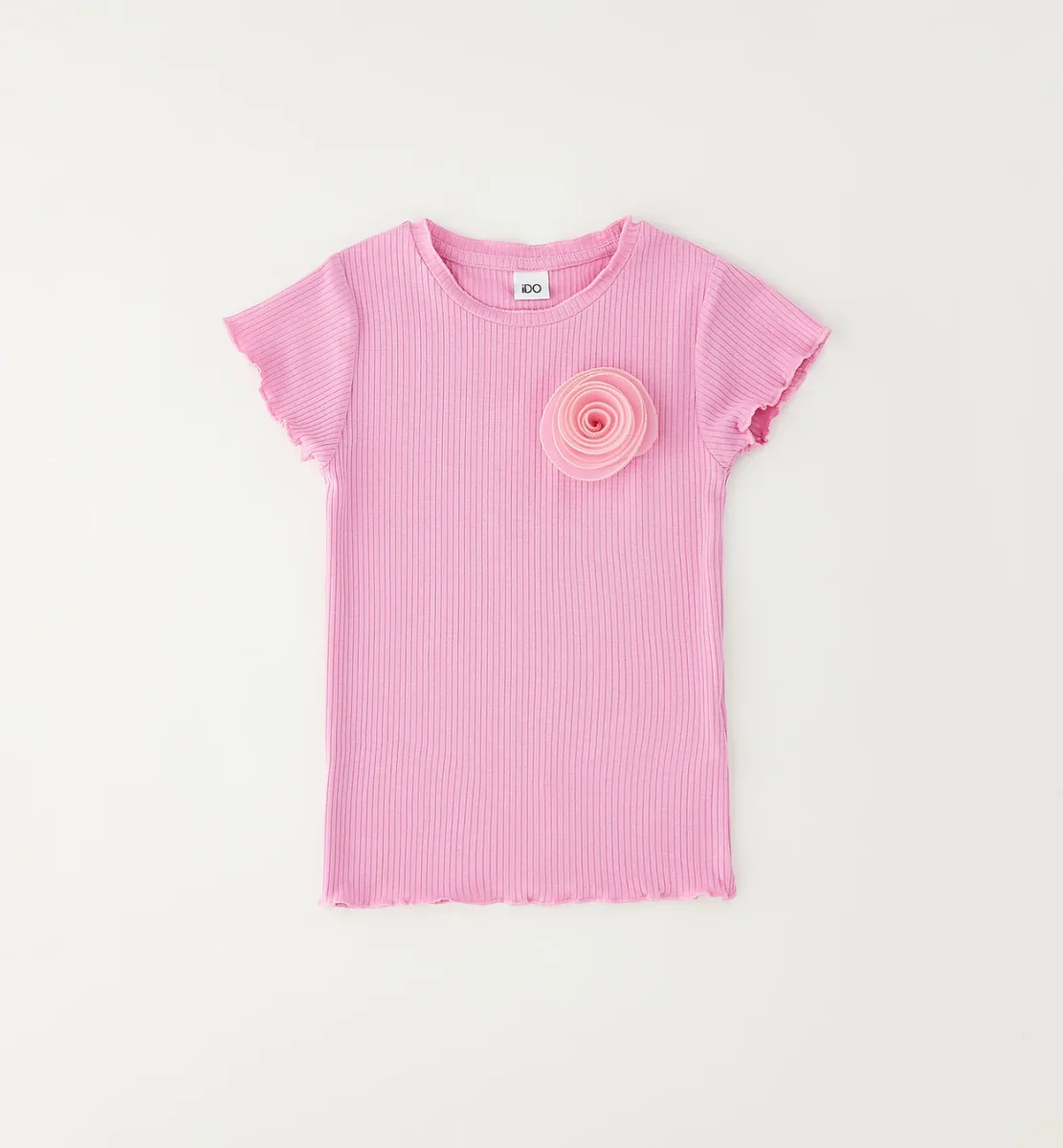 t-shirt bambina rosa a costine con fiore applicato โ maglietta a manica corta in morbido cotone elasticizzato a lavorazione costine, dal design delicato e femminile. modello con girocollo classico, maniche con bordo ondulato e applicazione floreale tono su tono sul petto che dona un tocco romantico e raffinato. vestibilitร confortevole e aderente, perfetta da abbinare a shorts, gonne o jeans per look estivi freschi e curati.