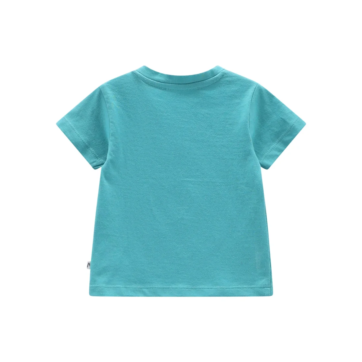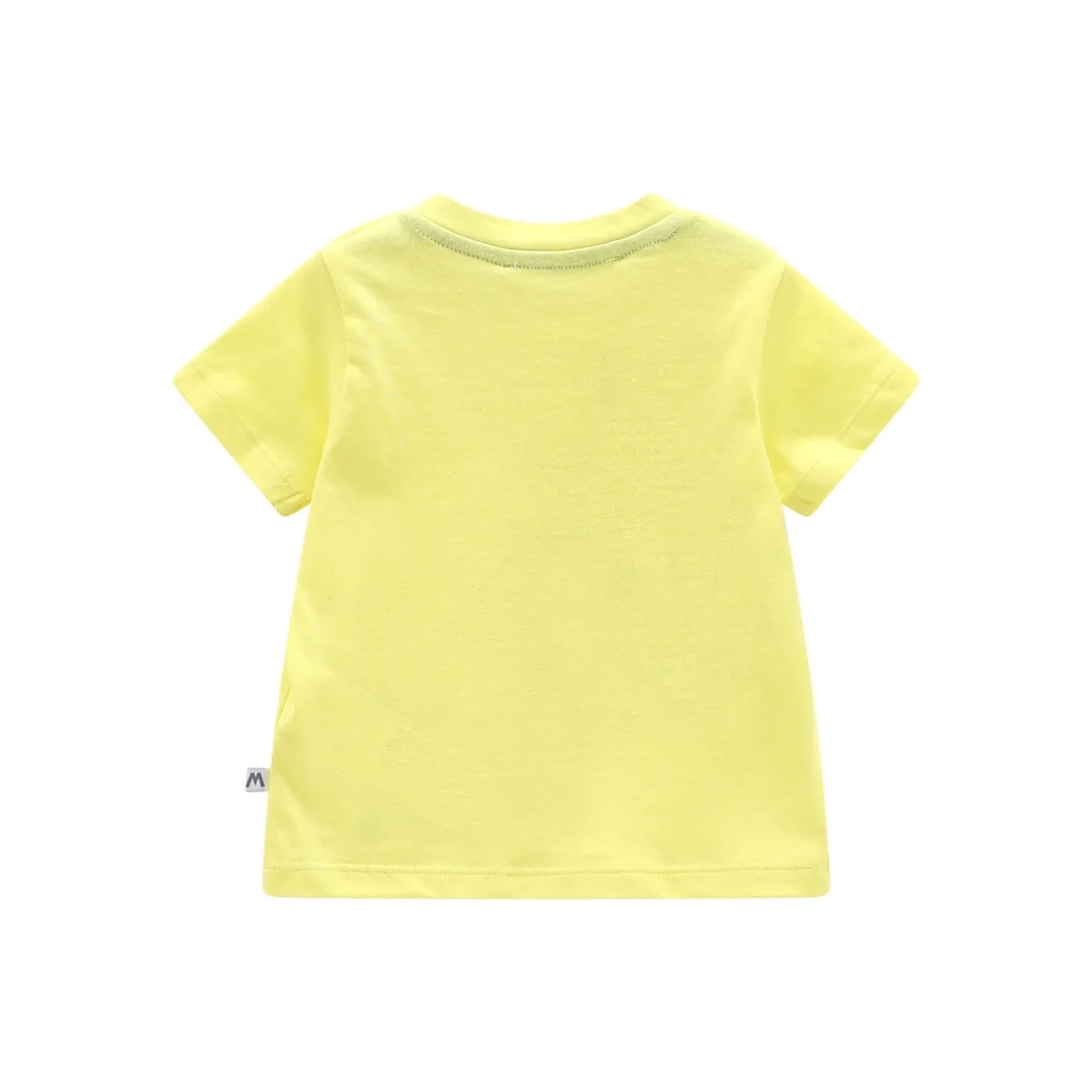t-shirt mezza manica bambino in cotone con stampa grafica โ€“ maglietta in morbido cotone disponibile in varianti colore turchese e giallo lime, entrambe caratterizzate da stampe frontali colorate a tema gioco e avventura dal mood estivo. modello con girocollo classico e vestibilitร  comoda, ideale da abbinare a shorts o bermuda per outfit freschi e casual perfetti per il tempo libero e le vacanze.