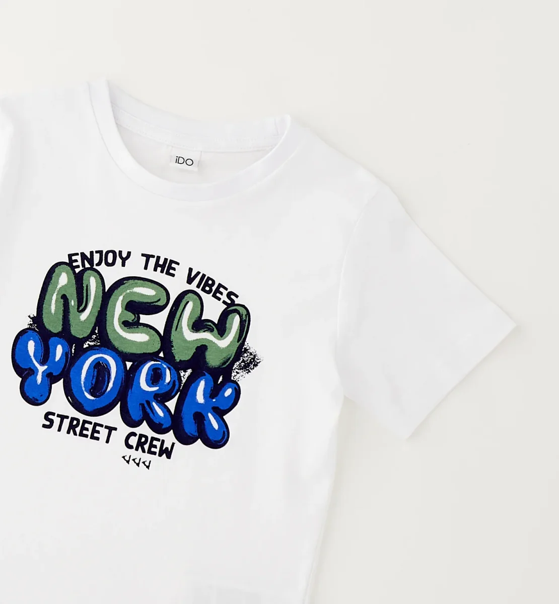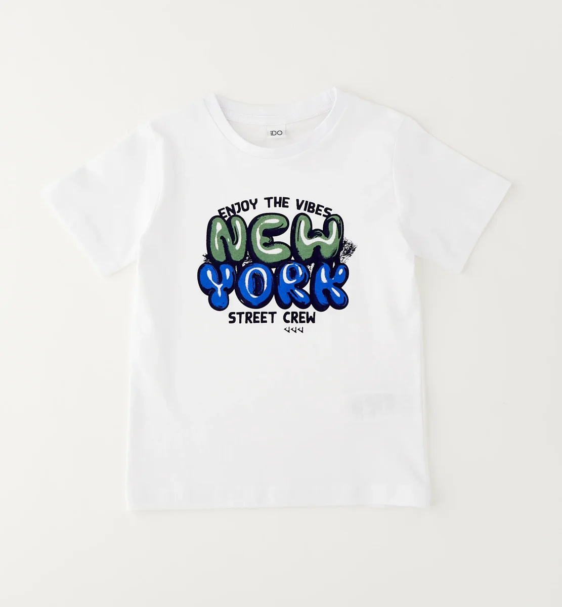 t-shirt bambino manica corta con stampa new york street crew โ maglietta in morbido cotone con girocollo classico e vestibilitร comoda, pensata per accompagnare i piรน piccoli nelle giornate estive con uno stile fresco e dinamico. il modello รจ caratterizzato da una grafica centrale โenjoy the vibes new york street crewโ con lettering effetto graffiti nei toni del verde e del blu che dona un look urban e moderno. disponibile in due varianti colore, bianco e giallo acceso, รจ perfetta da abbinare a bermuda sportivi, jeans o pantaloni casual per creare outfit pratici e grintosi ideali per il tempo libero e la scuola.