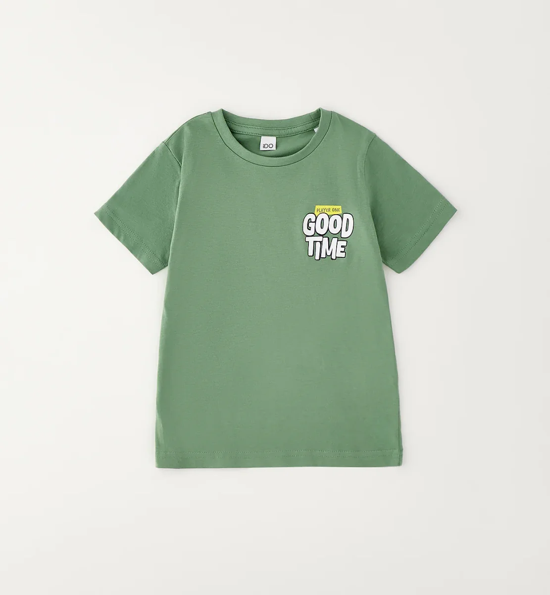 t-shirt manica corta bambino verde salvia con stampa lettering โ t-shirt in morbido cotone dalla vestibilitร comoda, caratterizzata da girocollo classico e maniche corte ideali per la stagione piรน calda. il design รจ impreziosito da stampa grafica frontale e maxi stampa posteriore โitโs always a good time to playโ con dettagli a contrasto che donano un tocco vivace e dinamico. perfetta da abbinare a bermuda, jeans o jogger per creare look casual e sportivi adatti alla scuola e al tempo libero.