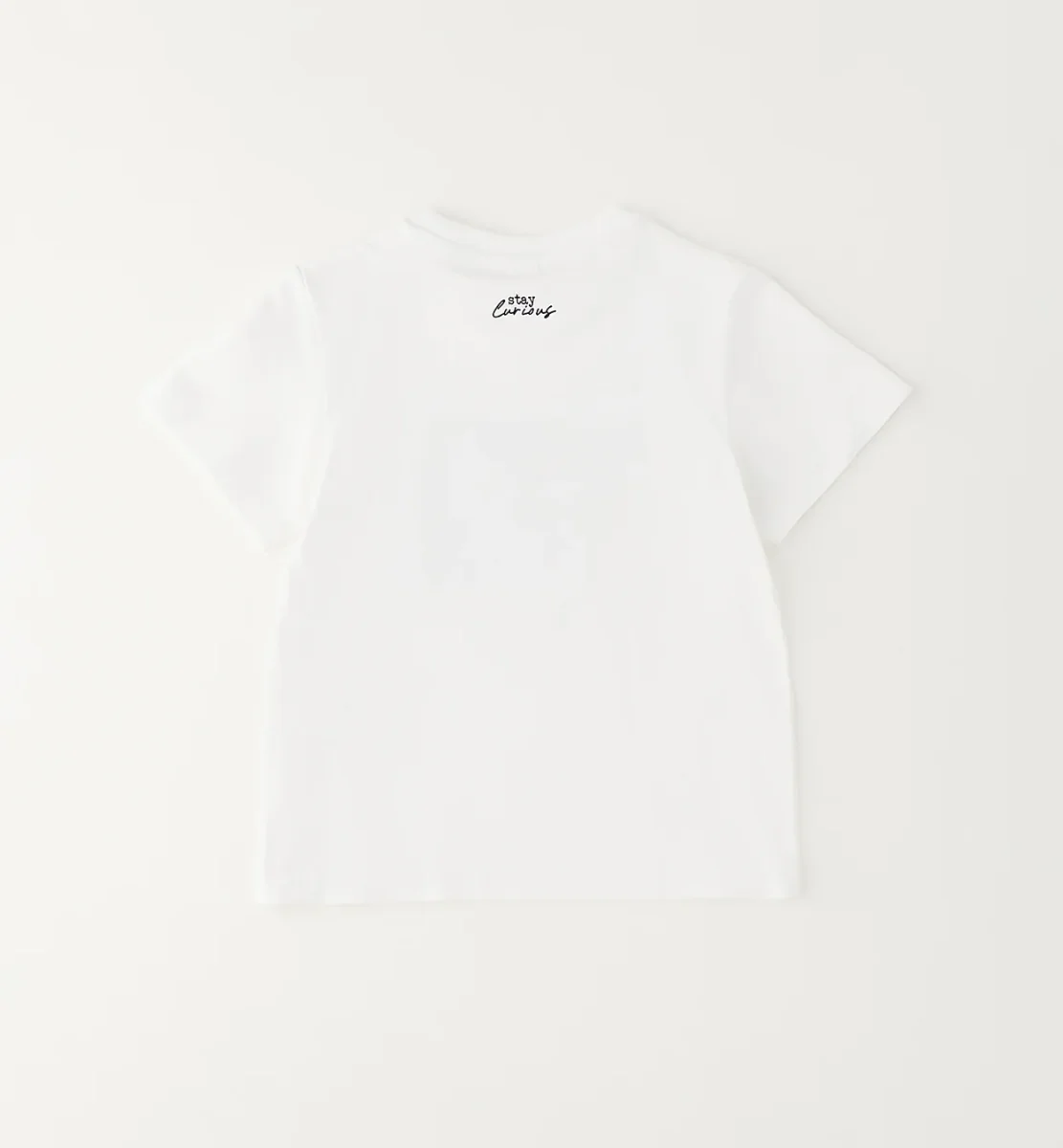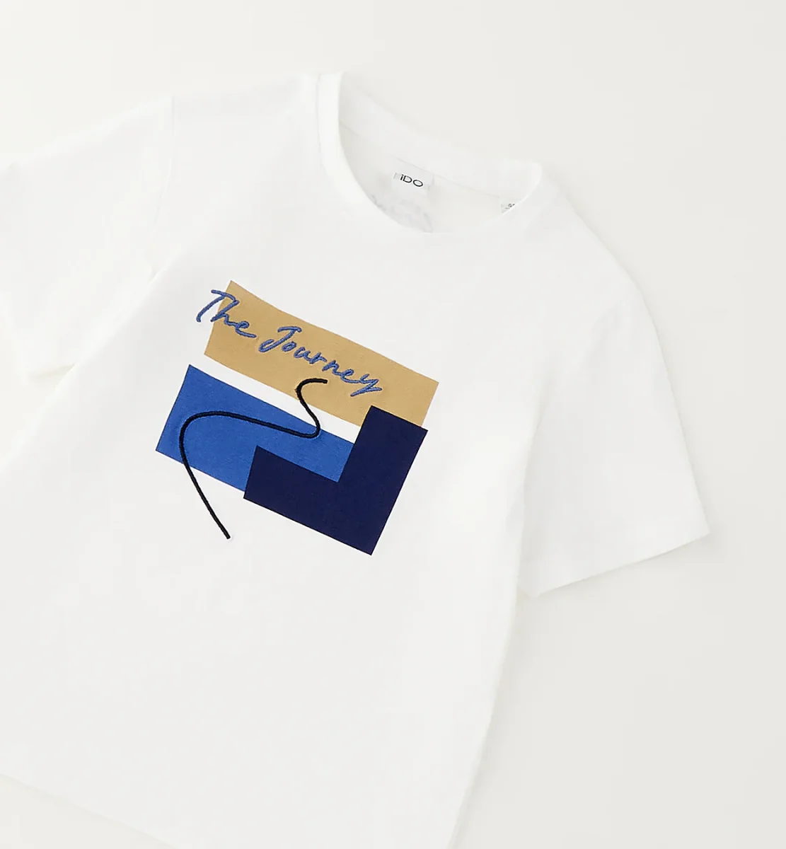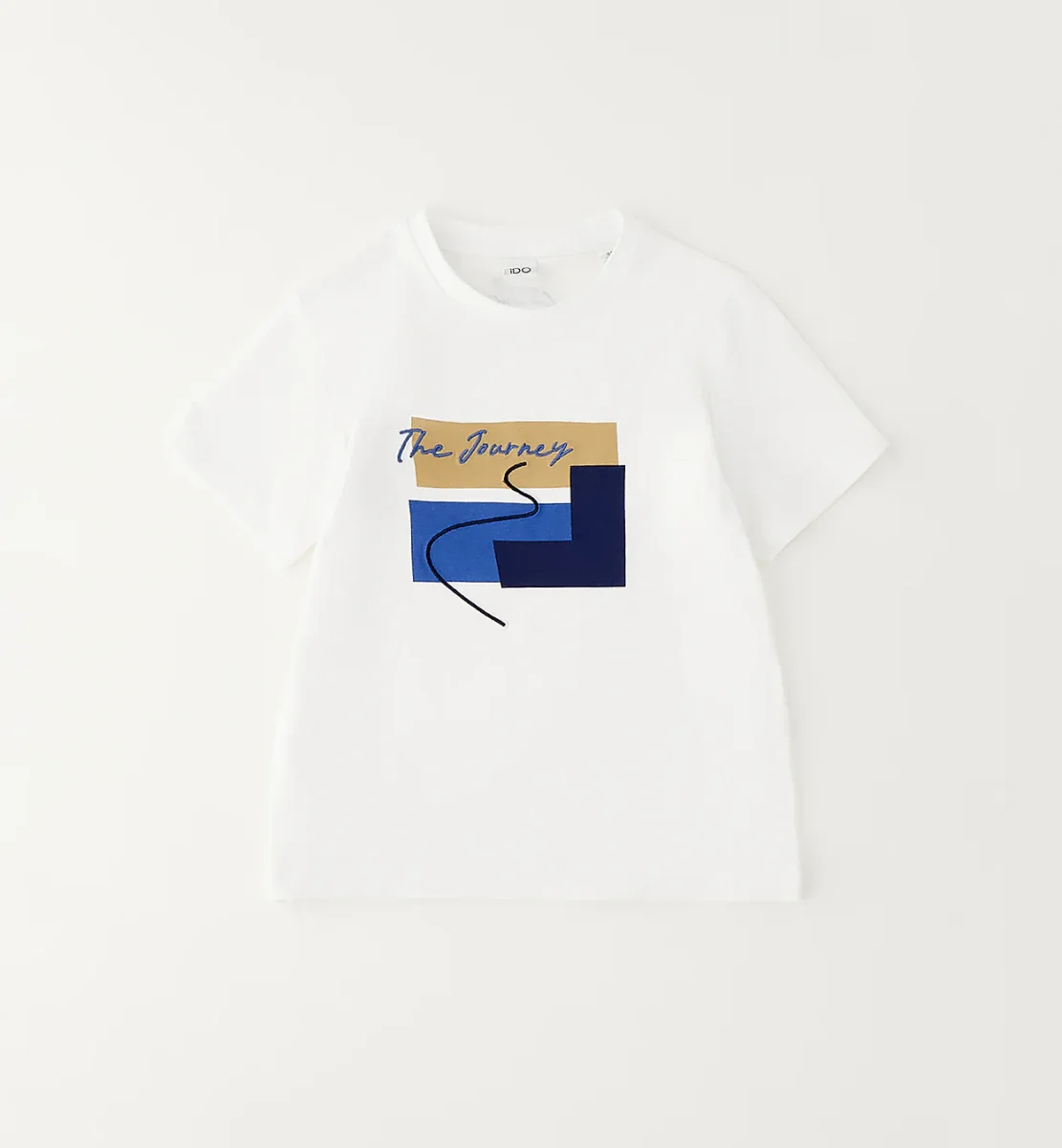 t-shirt manica corta bambino bianca con stampa grafica โthe journeyโ โ maglietta in morbido cotone dalla vestibilitร comoda con girocollo classico, caratterizzata da stampa frontale multicolor con scritta e grafica geometrica a contrasto per uno stile moderno e dinamico. modello fresco e versatile, ideale per completare look casual estivi, perfetta da abbinare a jeans, bermuda o jogger per outfit pratici ma ricercati.