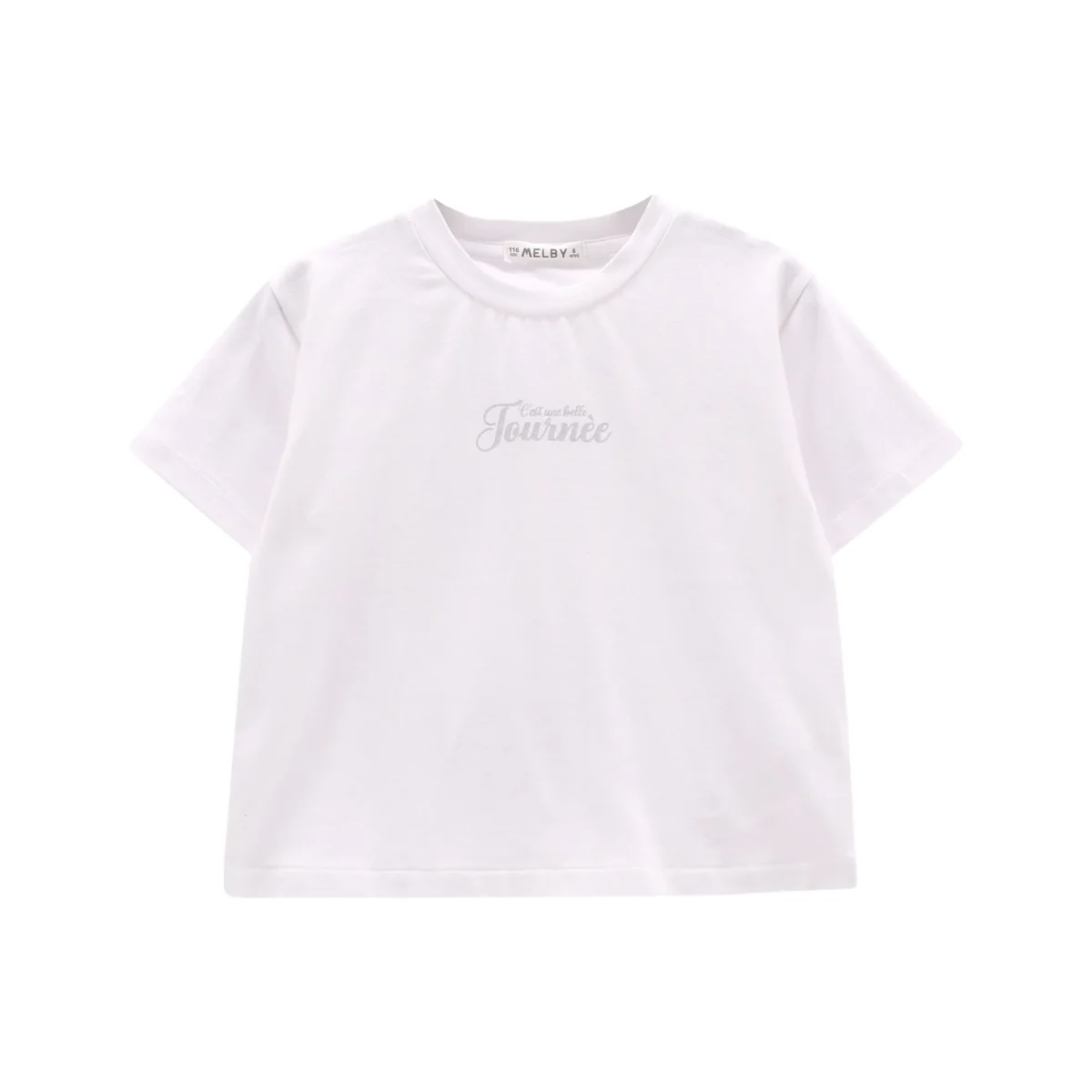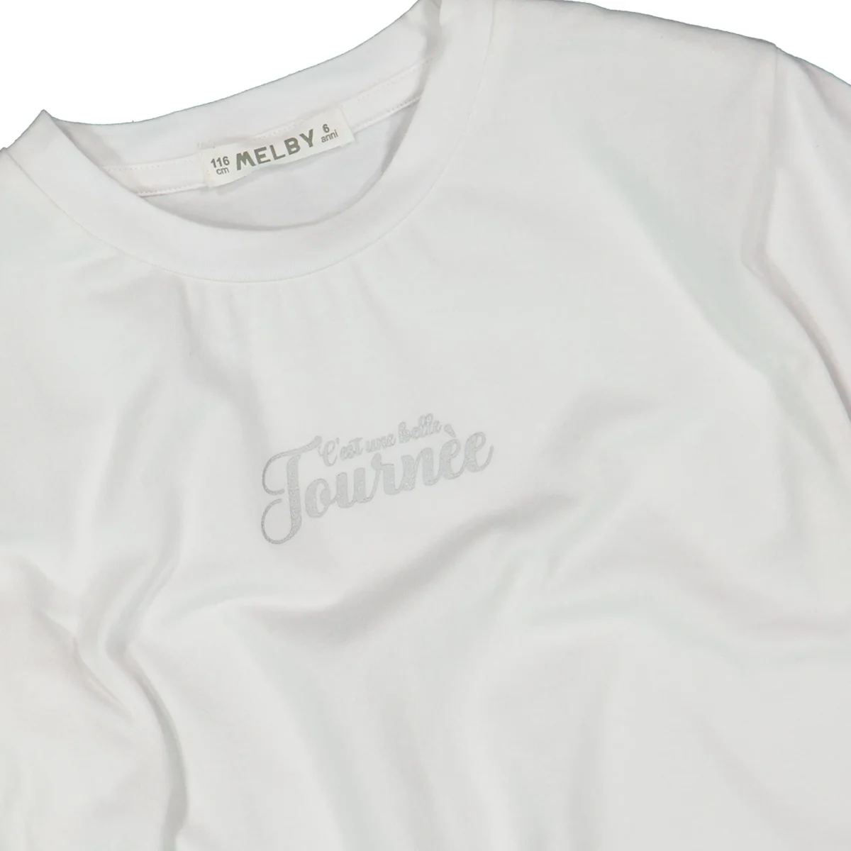 t-shirt ragazza bianca con stampa frontale tono su tono โ maglietta a manica corta in morbido cotone elasticizzato con scritta centrale effetto delicato โcโest une belle journรฉeโ, per uno stile essenziale ma raffinato. modello con vestibilitร comoda e girocollo classico, perfetta da abbinare a shorts, gonne o denim per look estivi freschi e versatili, ideale sia per il tempo libero che per outfit piรน curati.