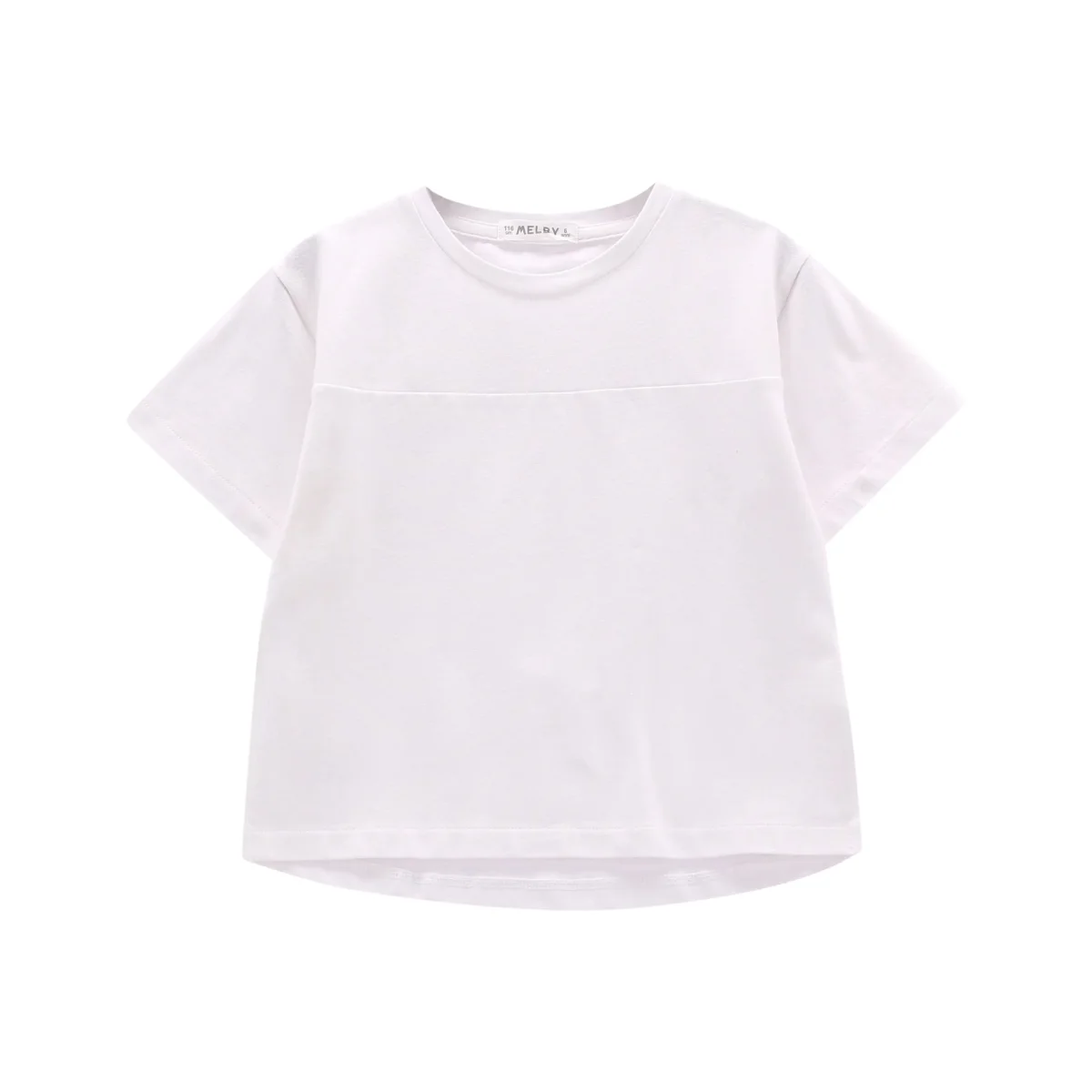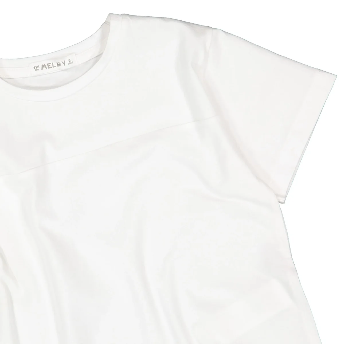 t-shirt ragazza bianca con taglio orizzontale โ maglietta manica corta in morbido cotone tinta unita con dettaglio cucitura frontale che crea un effetto taglio moderno e pulito. vestibilitร comoda e linea leggermente svasata sul fondo, ideale per look minimal ma curati, perfetta da abbinare a shorts, bermuda o gonne per outfit estivi freschi e versatili.