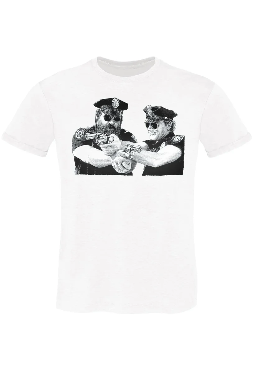 Indossare questa maglietta rappresenta un modo unico per celebrare il celebre duo poliziotti bud spencere e terencil attori i legendari piรน famosi di tutti i tempi. Unisce la passione per il cinema con uno stile contemporaneo e street.