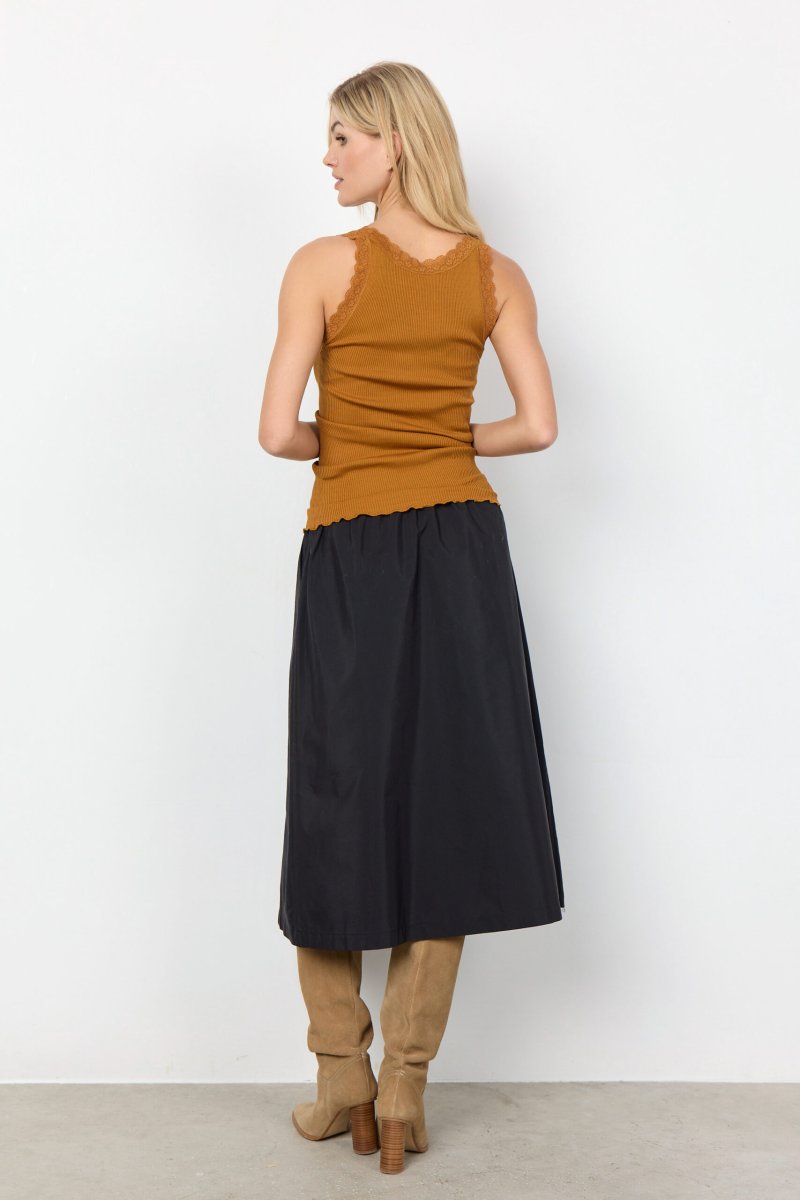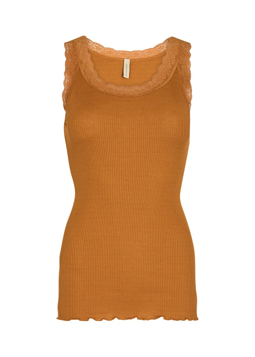 Parole chiave: Top in seta e cotone, SC-Sarona 1, top lusso, top femminile, top con dettagli in pizzo, top colore bruciato.