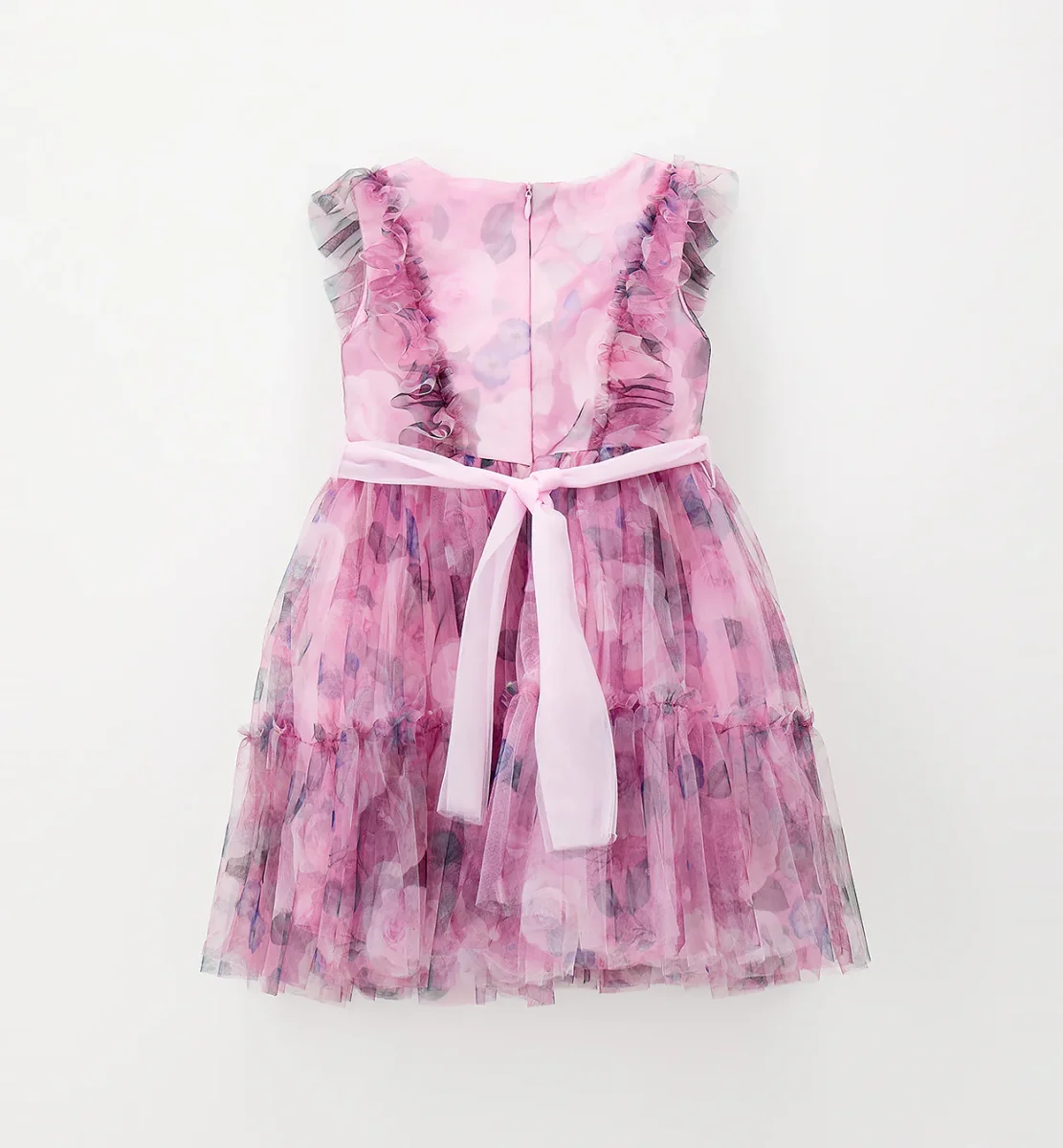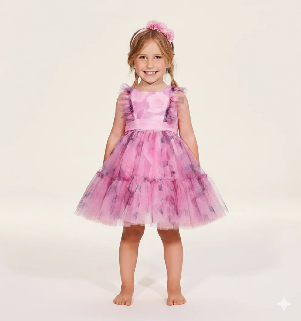 vestito bambina rosa in tulle floreale con balza e cintura โ abito elegante in leggero tulle stampato con motivo floreale nei toni del rosa e del lilla, pensato per occasioni speciali e cerimonie. modello senza maniche con delicati volant sulle spalle, gonna a balze morbide e cintura tono su tono in vita che valorizza la vestibilitร . chiusura con zip sul retro per una vestizione pratica e confortevole. ideale da abbinare a ballerine o sandaletti per un look raffinato e romantico, perfetto per feste, compleanni e momenti importanti.