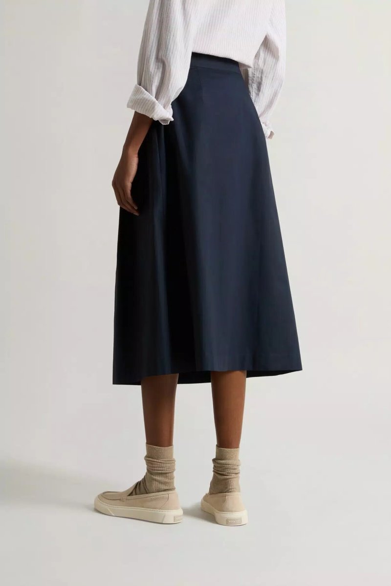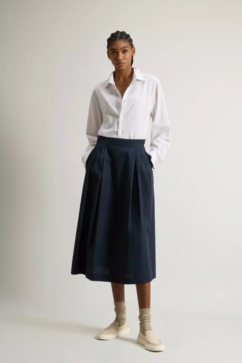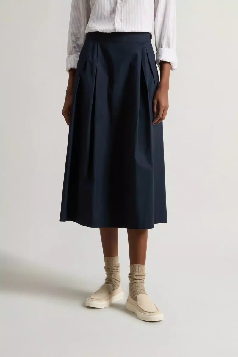 Questa gonna in popeline di puro cotone รจ ideale per chi cerca freschezza, comfort e uno stile curato. Le pieghe sul davanti aggiungono movimento al modello, mentre le tasche laterali a filetto offrono praticitร . La chiusura con zip e bottone logato sul lato completa il design, rendendola una scelta versatile e funzionale per ogni occasione